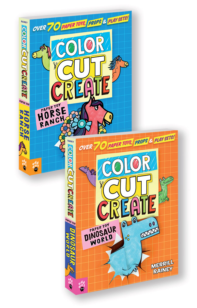 Merrill's Color, Cut, Create Play Sets: Dinosaur World and Horse Ranch are three activity books in one: color your dinosaur or horses, cut out and construct it into your paper toy, and create imaginative stories, dioramas, and more! All you need is scissors, markers, and glue. No fussy instructions or delicate designs that crumble at the slightest touch. These are paper toy that kids are actually meant to play with. It's paper engineering made easy!
