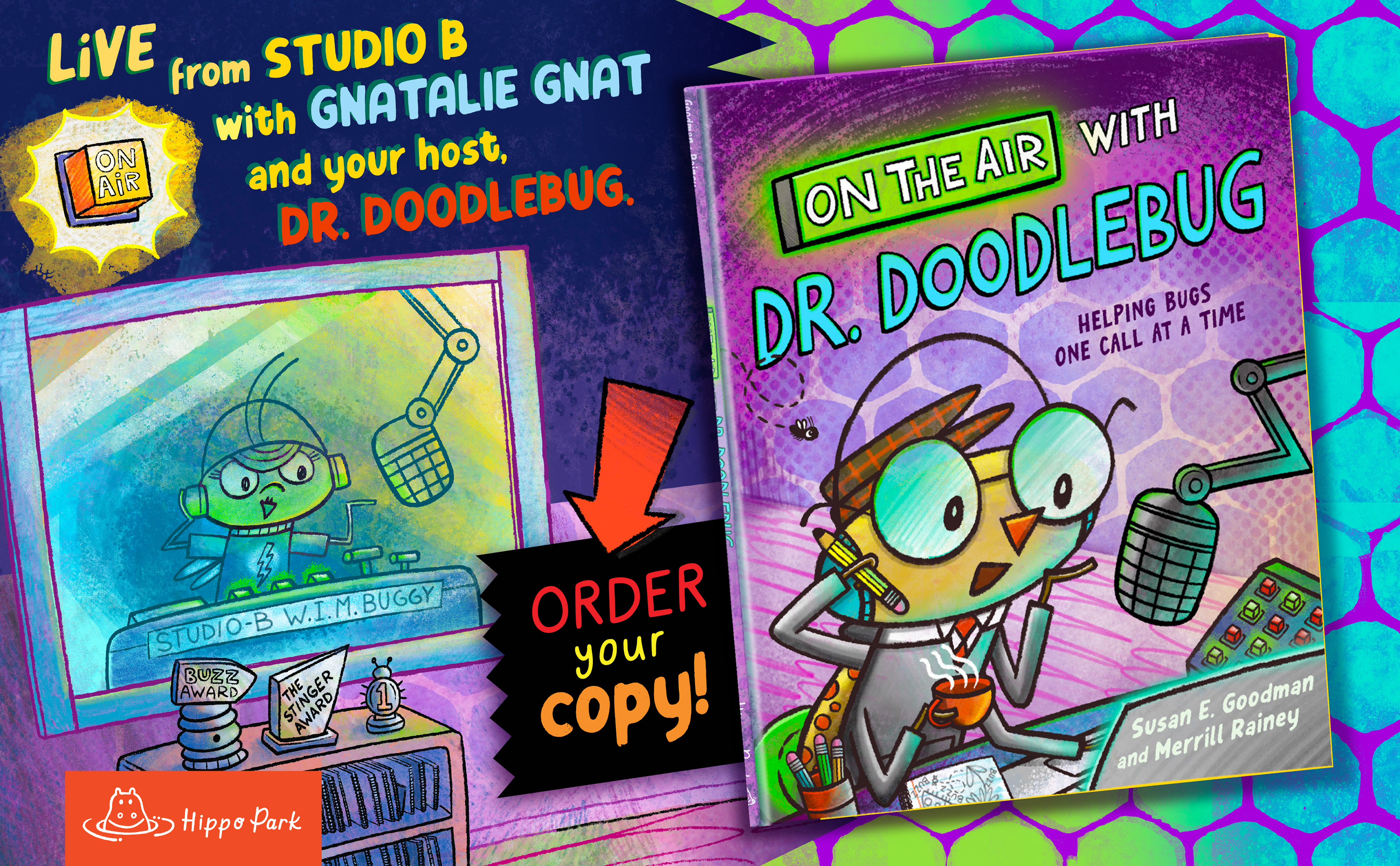 From award-winning creators Susan E. Goodman and Merrill Rainey comes something really fun: a radio show in a book! Meet our bug expert: Dr. Doodlebug. Dr. D hosts a radio talk show called On The Air With Dr. Doodlebug, where he answers the burning questions bugs have. Why does a caterpillar get SOOO hungry before . . . changing? How can lightning bugs use less electricity? With terrific repartee and fabulous illustrations, this inviting format, illustrated by Merrill Rainey in comic book style, will enchant bug enthusiasts, their adults, and educators alike. Bring all your questions. Dr. Doodlebug’s got the answers!