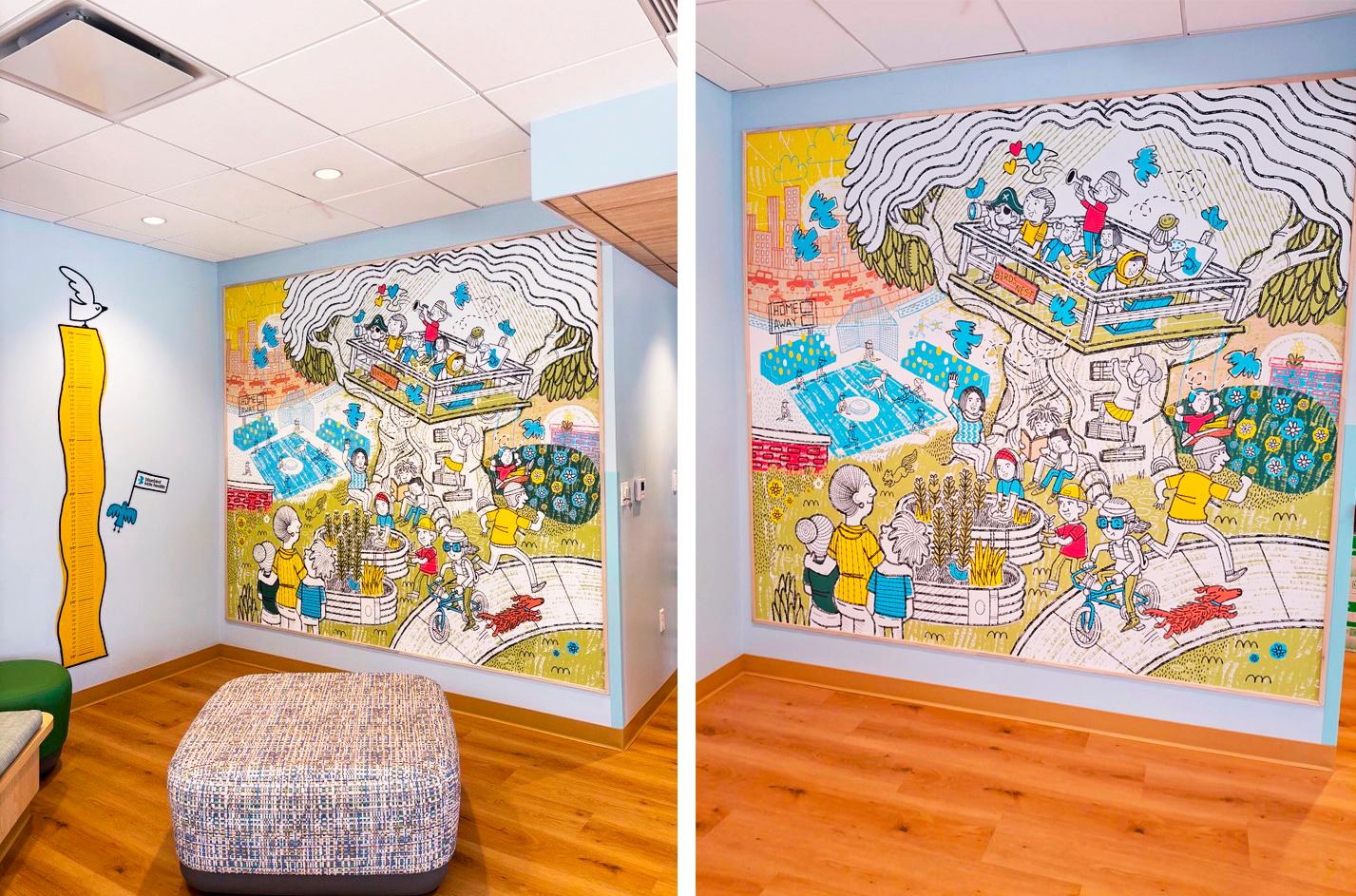 The wall was paired with a printable card that highlighted all of the hidden objects a patient could fine. The card was also designed to be a takeaway for Bluebird Kids Health.